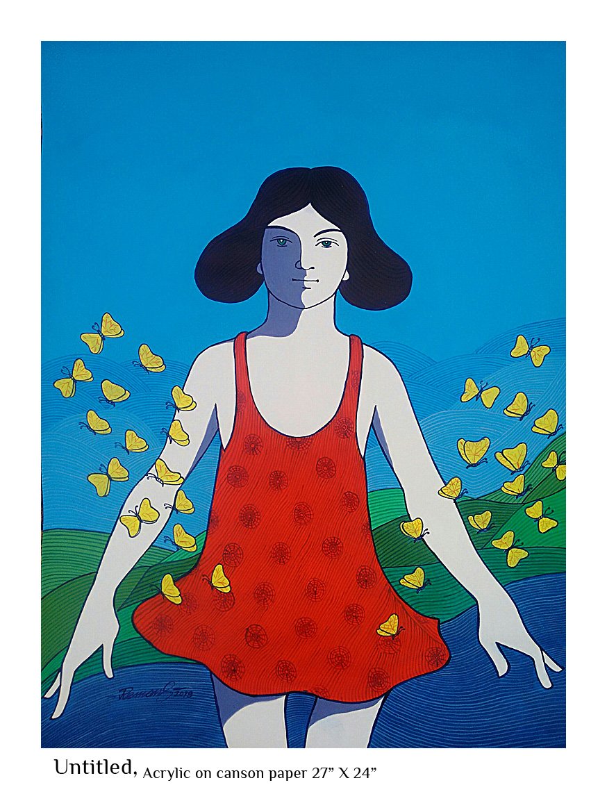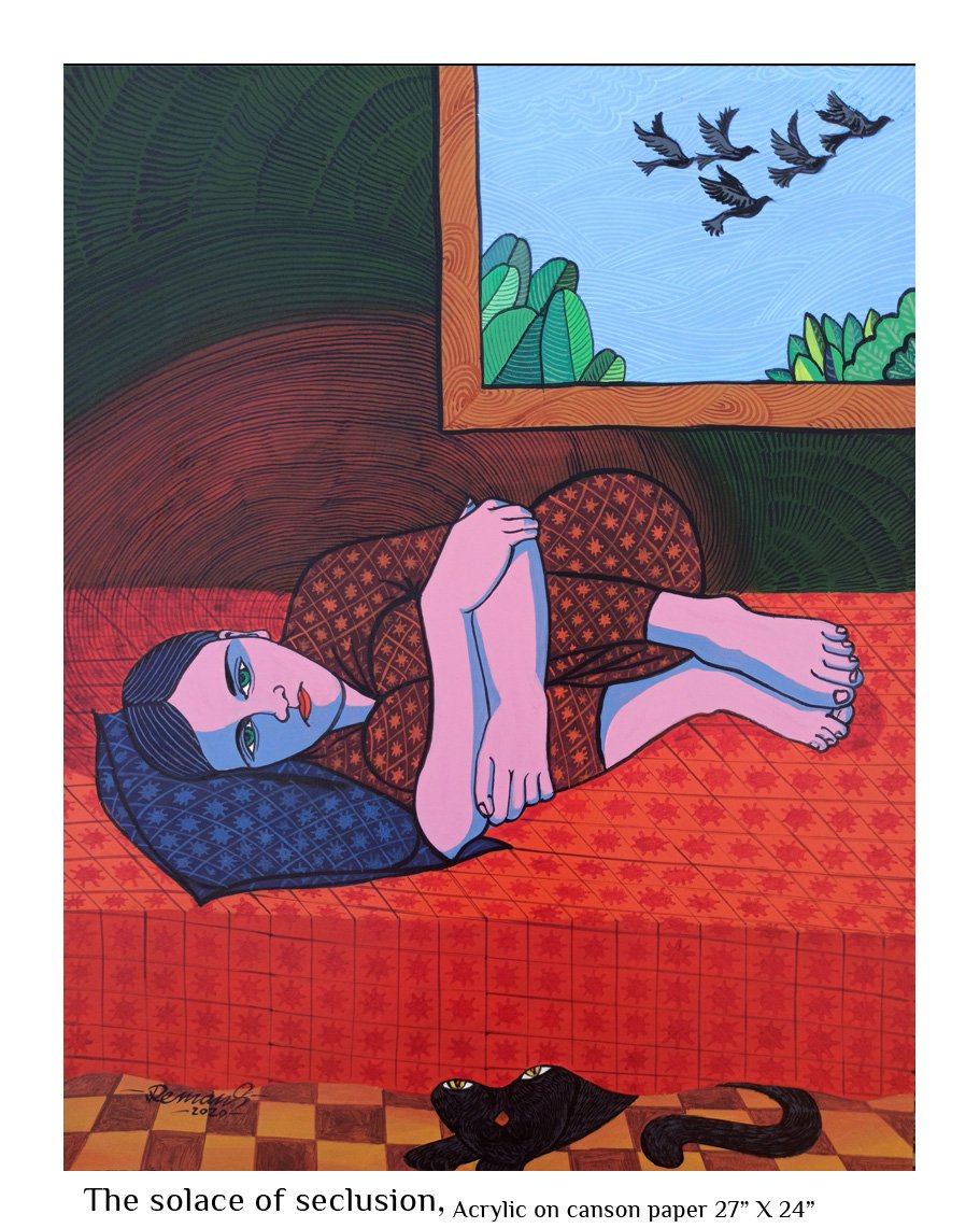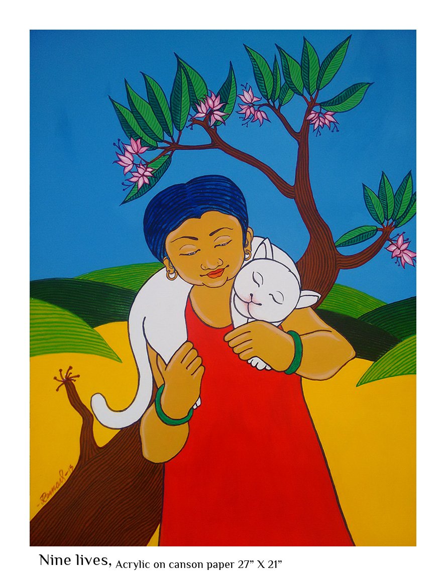 The Feminine Mystique is then an exploration of nature as exemplified in women not as a gender but as an integral aspect of life itself. Thematically, it opens up enormous possibilities and I have tried to interpret it employing common motifs that we can relate to easily. Each paining in this series reflects my idea of what constitutes the feminine mystique. Simple but sublime. That is what I seek to achieve through this.