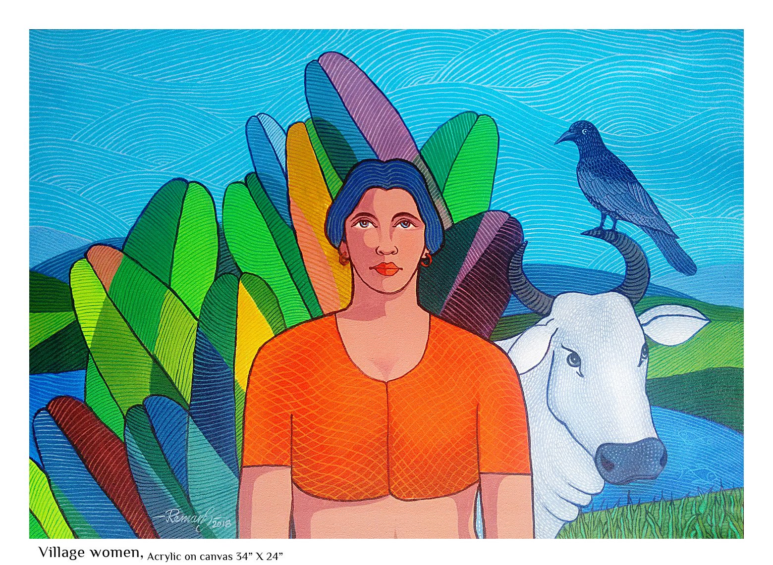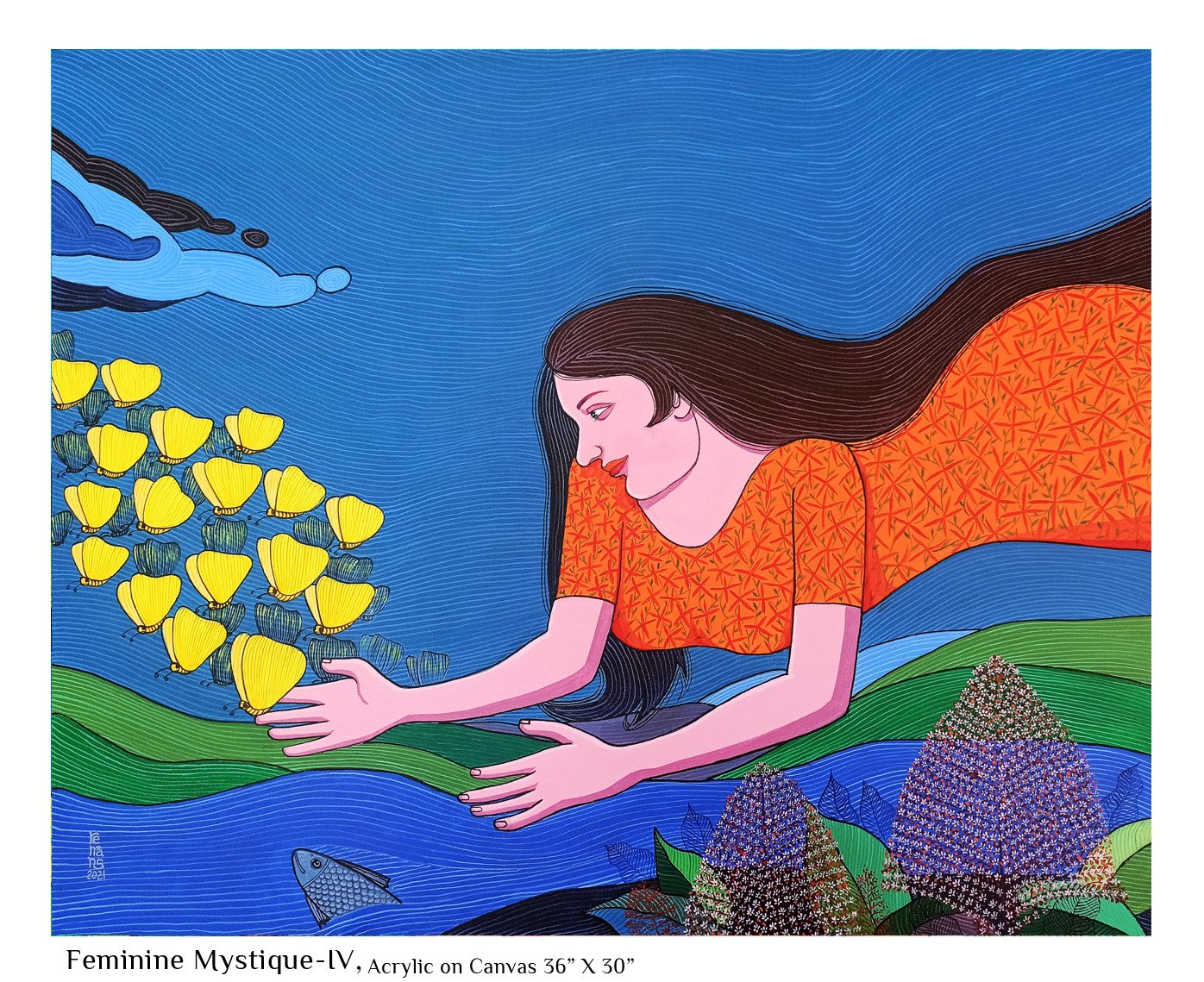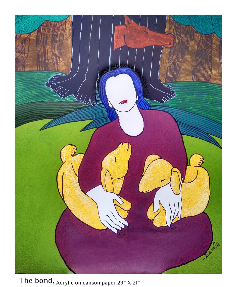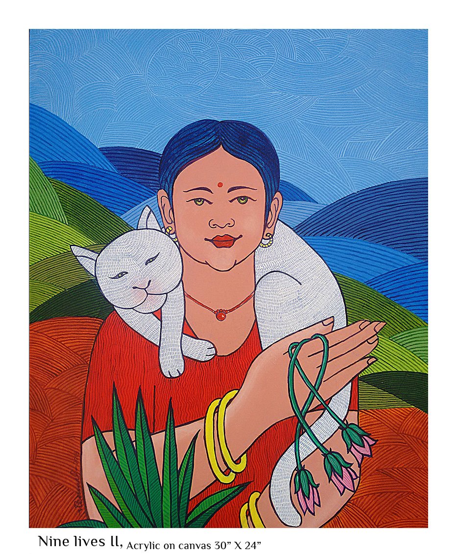 Right from an early age, nature has fascinated me. The wild energy, the fecundity, the raw power as much as the beauty, the stillness, the grace stuck a chord in me. I saw this mostly in feminine terms and as I was growing up I could relate this to that special something that women seemed to be blessed with - the strong bond with nature which men mostly are cut off from. When I began to paint, this influence was pretty mush evident not only in the choice of subject but in all aspects of my artistic endeavour, the colors, the motifs, the themes… Most of the paintings I have done that comes under the Feminine Mystique category, by deliberate choice or not, incorporate personal experiences from my growing up years that took on new meaning within the ambit of the theme.